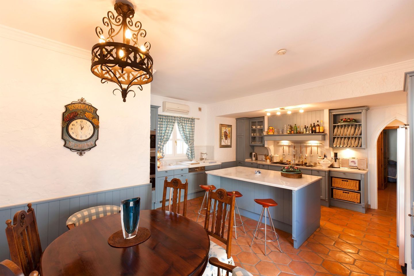 Войдите в мир элегантности через очаровательный крытый входной портик, ведущий к старинным входным дверям и уютному холлу. Просторная гостиная-столовая с открытым камином плавно переходит в крытую террасу и великолепный, полностью выложенный плиткой внутренний двор, украшенный фонтанами. На том же уровне вы найдете просторную, полностью оборудованную кухню в деревенском стиле с уютным уголком для завтрака и выходом во второй внутренний двор, с лестницей, ведущей к привлекательной зоне бассейна.