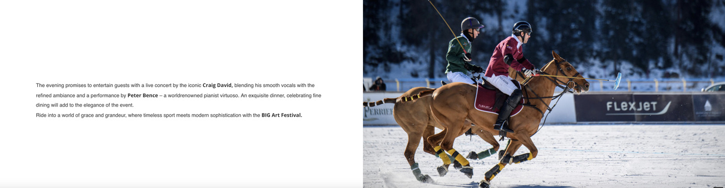 ❄️ Присоединяйтесь к нам на эксклюзивном гала-вечере 26 января, который пройдет в рамках знаменитого Кубка мира по снежному поло на живописном альпийском курорте Санкт-Мориц. На фоне потрясающих заснеженных вершин вас ждет сочетание спорта, роскоши и развлечений мирового класса.
